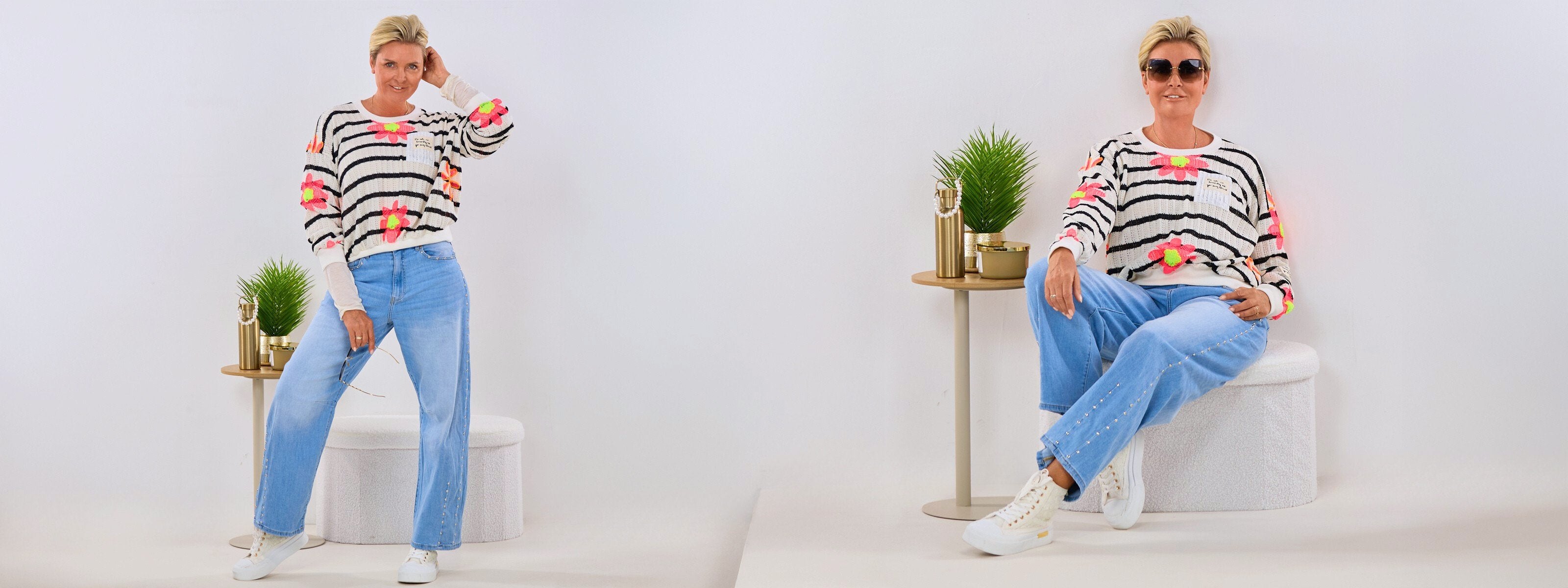 Gestreifter Pulli mit Blüten, creme-schwarz-pink